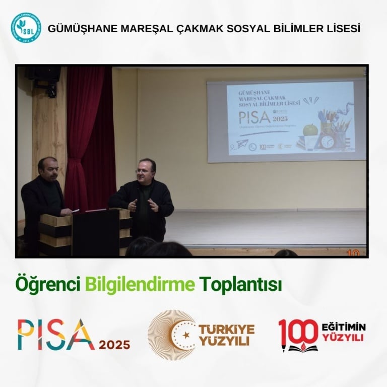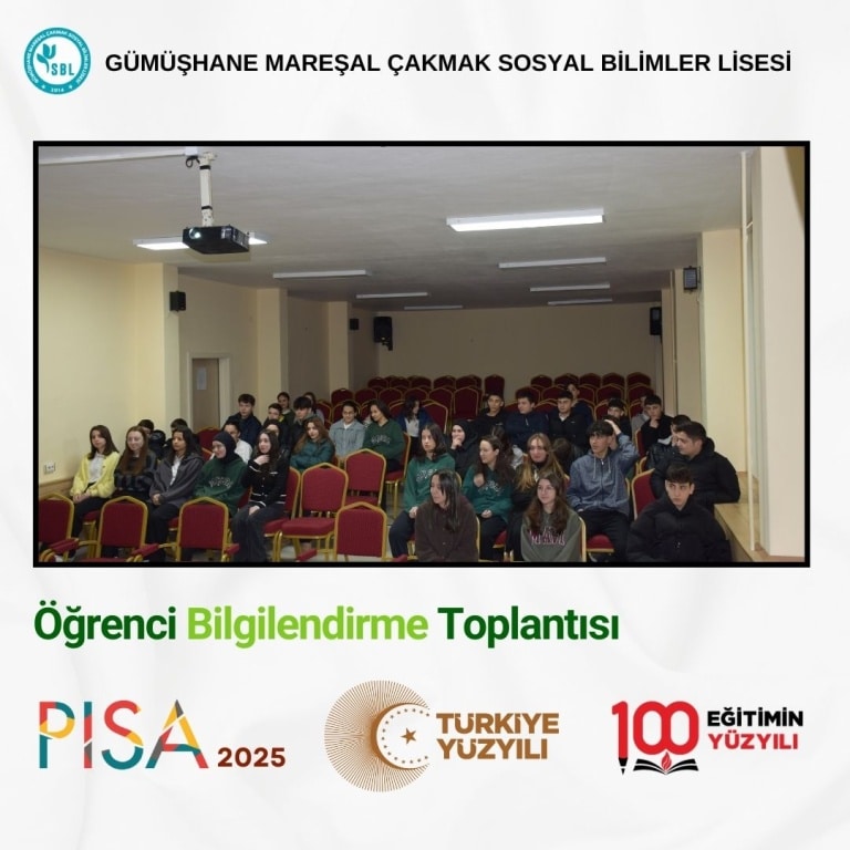 Gümüşhane Mareşal Çakmak Sosyal Bilimler Lisesi, 15 Nisan-15 Mayıs 2025 tarihleri arasında düzenlenecek Uluslararası Öğrenci Değerlendirme Programı (PISA) nihai uygulaması öncesi öğrencileri bilgilendirmek amacıyla 10 Şubat 2025 tarihinde bir toplantı düzenledi. PISA 2025’e katılacak olan okulumuz öğrencileri, sürece ilişkin detayları bu toplantıyla öğrendi.
