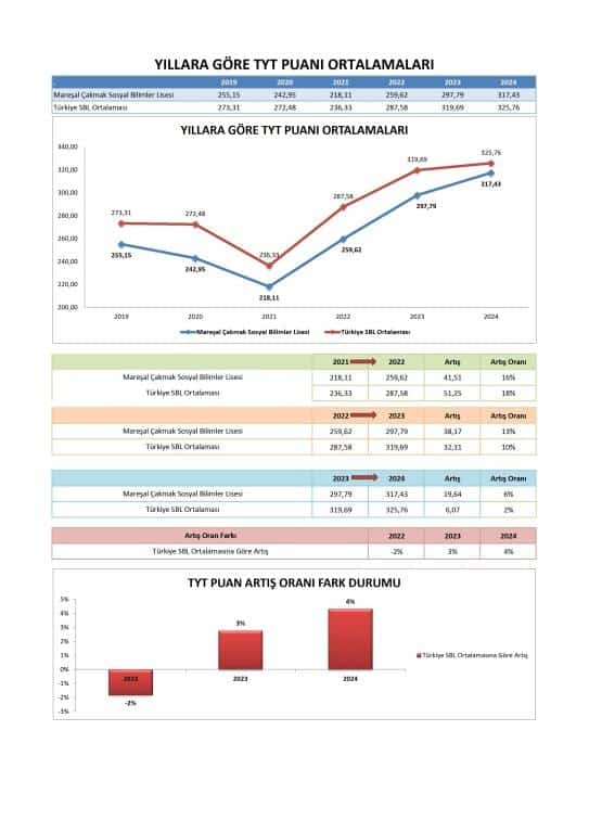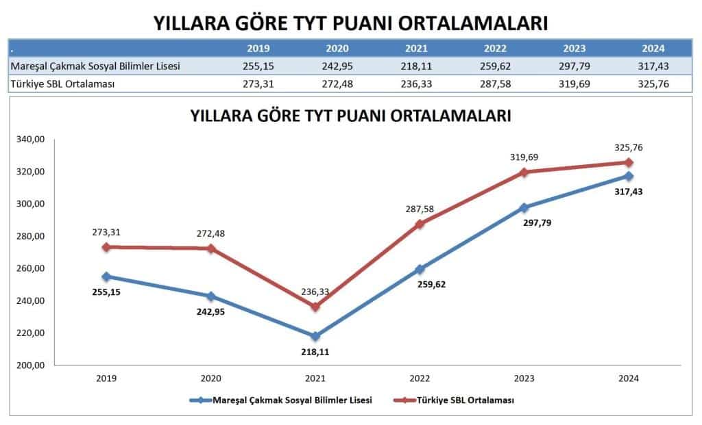 Önemli genel iyileşme: Okulun ortalama TYT puanları sürekli olarak yükselmiş, ulusal ortalama ile arasındaki farkı kapatmış ve etkili bir akademik gelişimi işaret etmiştir.