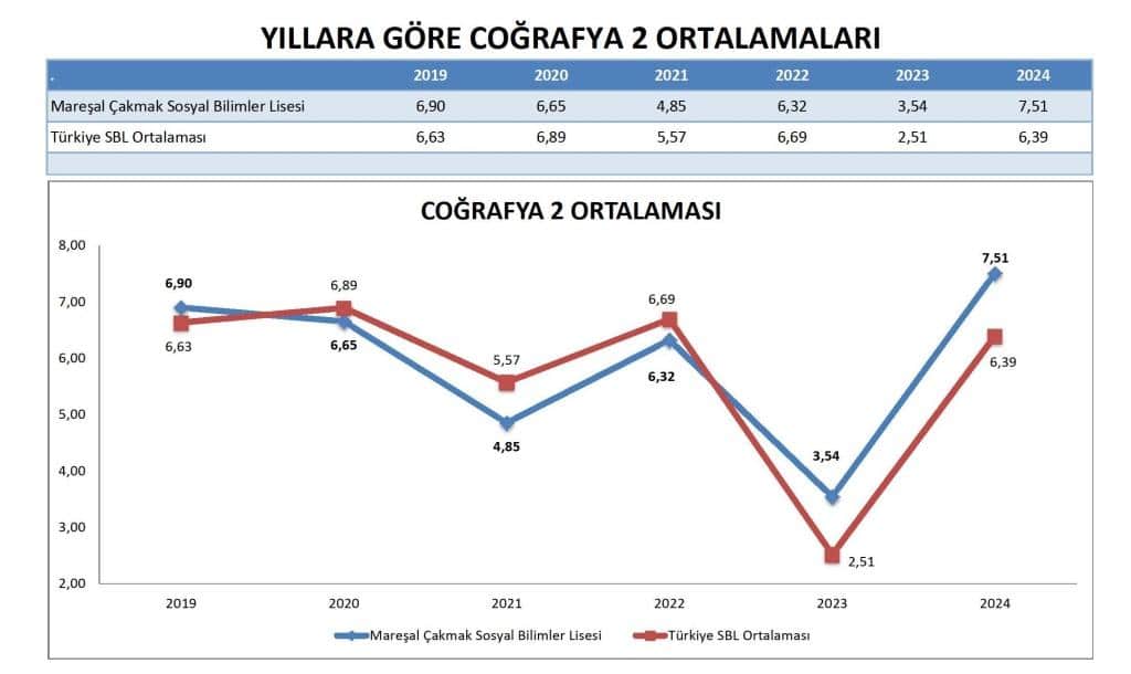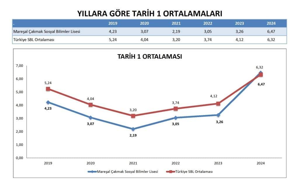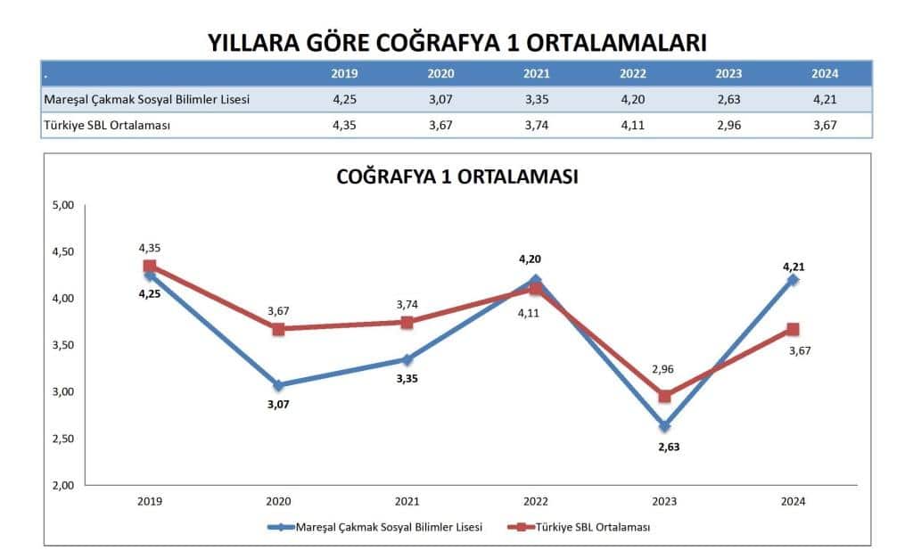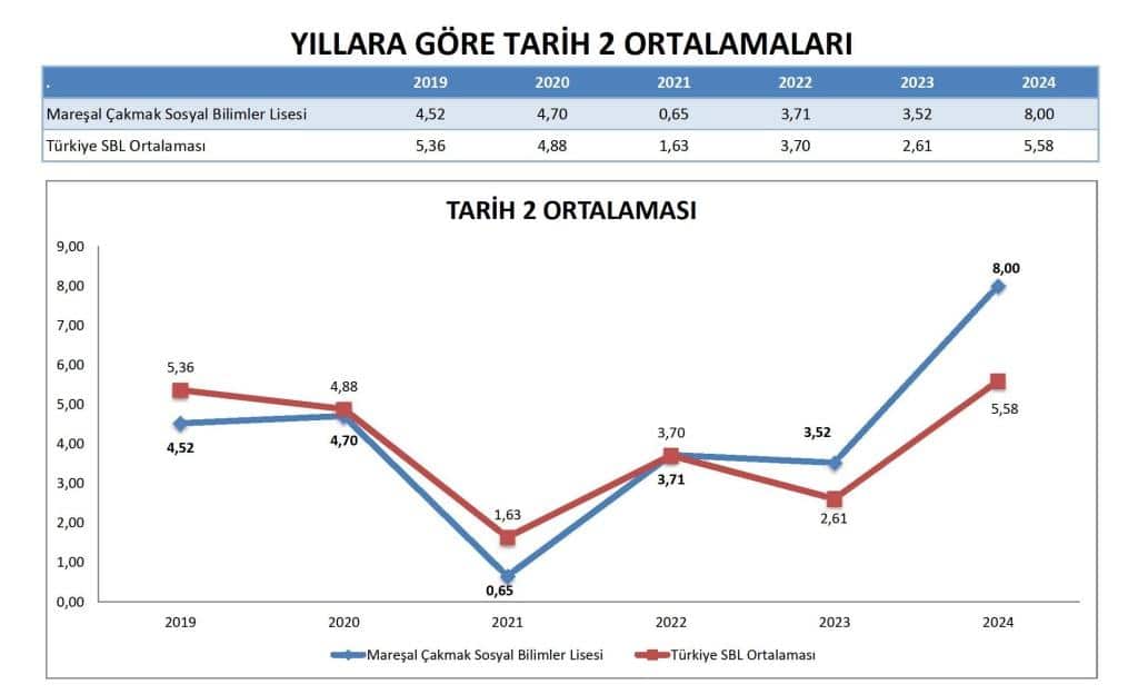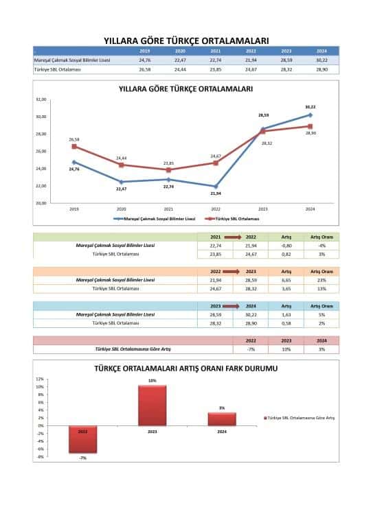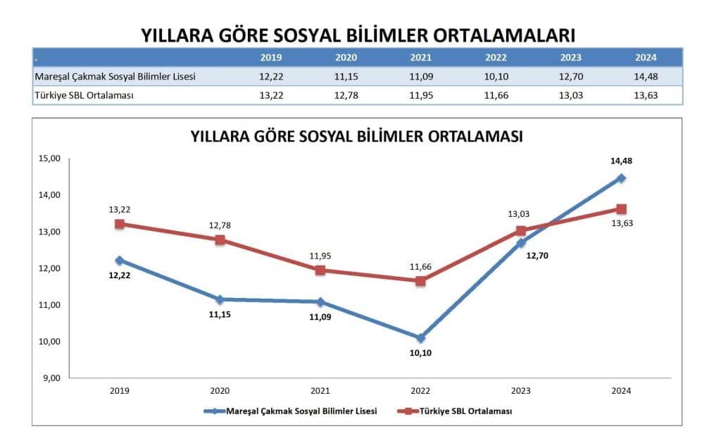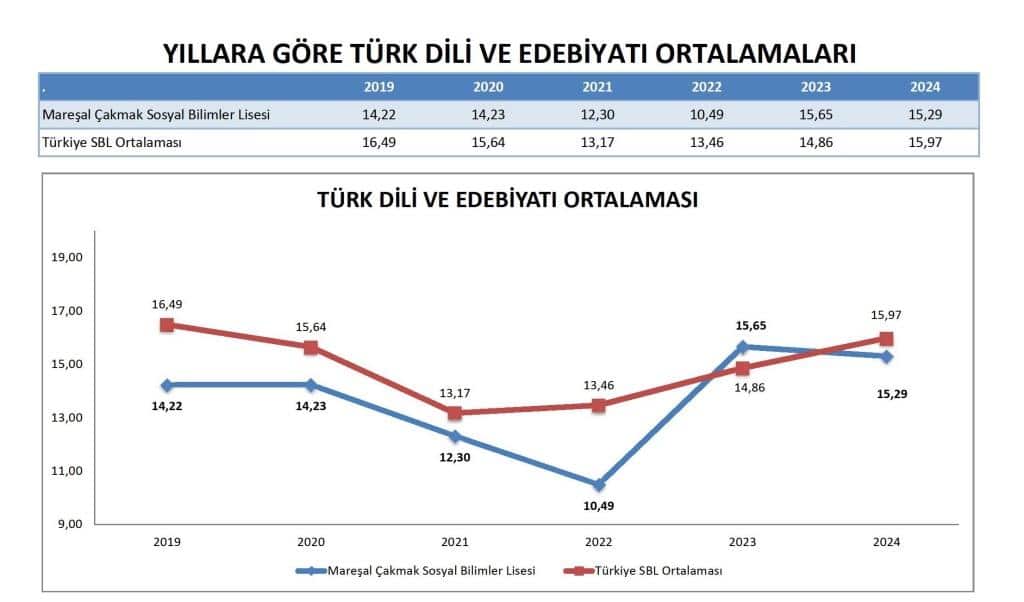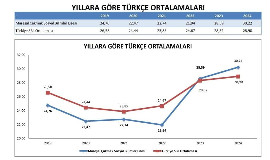 2023 ve 2024 yıllarında, Mareşal Çakmak Sosyal Bilimler Lisesi'nin Türkçe ortalaması ulusal ortalamayı aşarak 2024'te 30.219'a ulaşmıştır (ulusal SBL ortalaması 28.901 iken). Bu, öğrencilerin Türkçe dil yeterliliğinde kayda değer bir iyileşme olduğunu göstermektedir.
