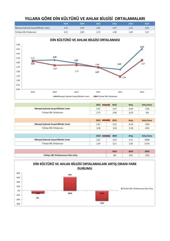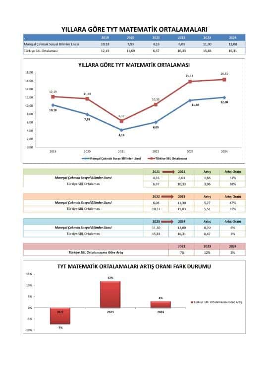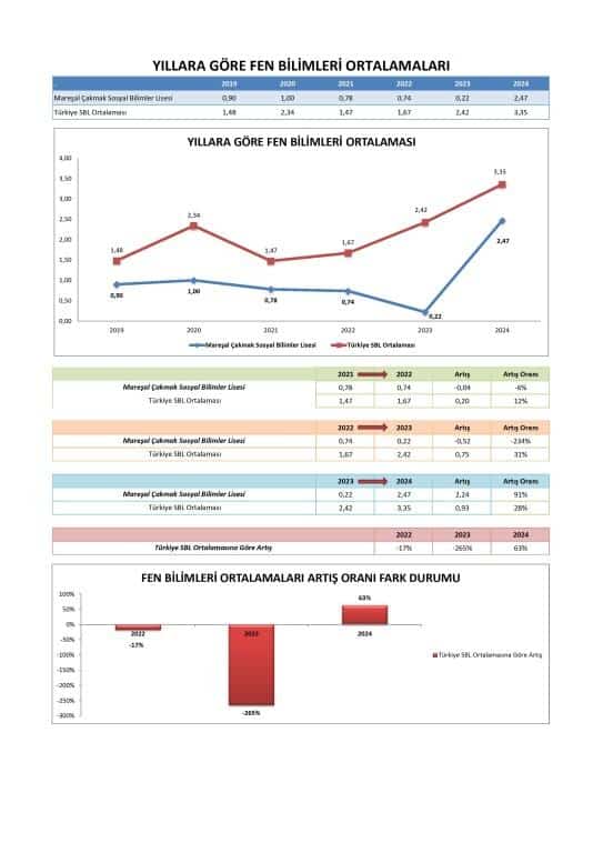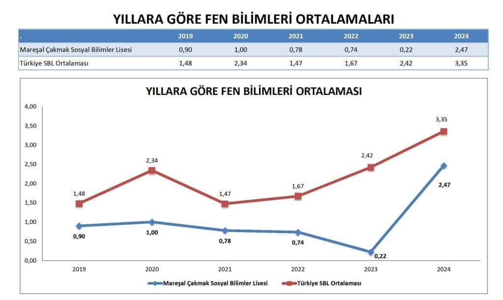 Fen Bilimleri: 2024'te önemli bir iyileşme olmasına rağmen, okulun Fen Bilimleri ortalaması hala ulusal SBL ortalamasının altındadır. Bu alana sürekli odaklanma, genel YKS puanlarını daha da artırabilir.