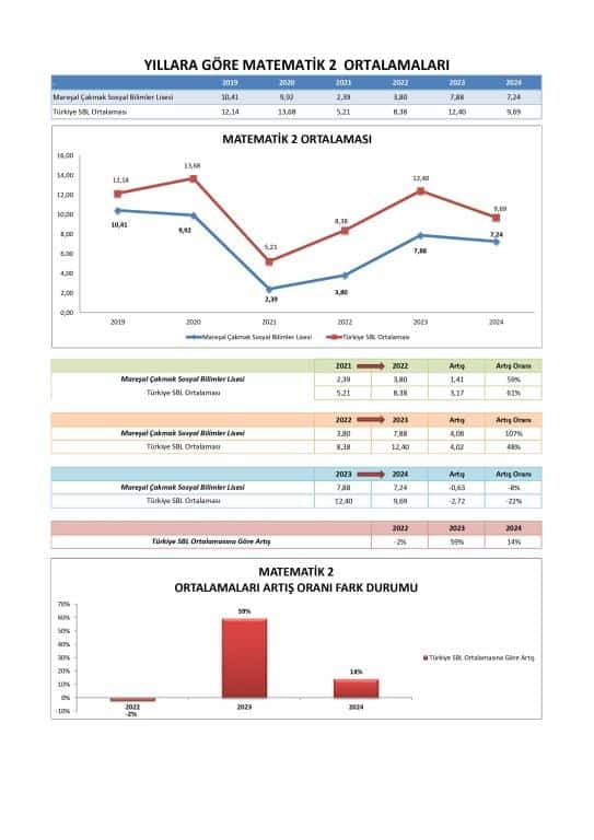 Okulun ortalaması 2021'den 2024'e kadar artış gösterse de (4.157'den 12.000'e), ulusal ortalama ile arasındaki fark (2024'te 16.305) dikkat çekicidir. Bu, matematiğin daha fazla geliştirilmesi gereken bir alan olabileceğini düşündürmektedir.