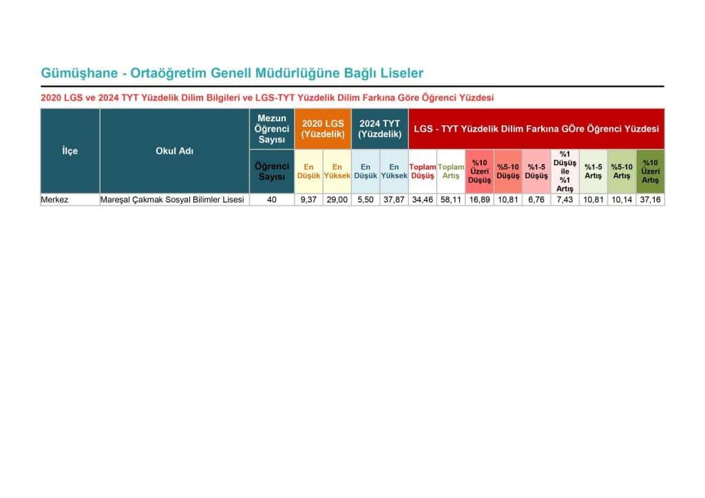Bir Ölçme ve Değerlendirme Uzmanı olarak, Mareşal Çakmak Sosyal Bilimler Lisesi'nin 2019-2024 yılları arasında YKS'de takdire şayan bir ilerleme kaydettiğini değerlendiriyorum. Okul, sözel ve sosyal bilimler ağırlıklı alt testlerdeki güçlü ve çoğu zaman üstün performansıyla, sosyal bilimlere odaklanmasını başarılı bir şekilde değerlendirmiştir. LGS'den TYT'ye öğrenci yüzdelik dilim sıralamasındaki iyileşme verileri, okulun öğrenci başarısı üzerindeki olumlu etkisini daha da pekiştirmektedir. Matematik ve fen bilimlerinde geliştirilmesi gereken açık alanlar olsa da, genel gidişat Sosyal Bilimler Lisesi kategorisinde oldukça başarılı bir kurumu işaret etmektedir.