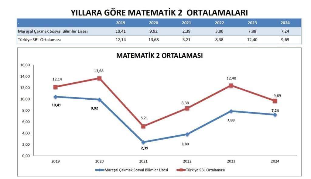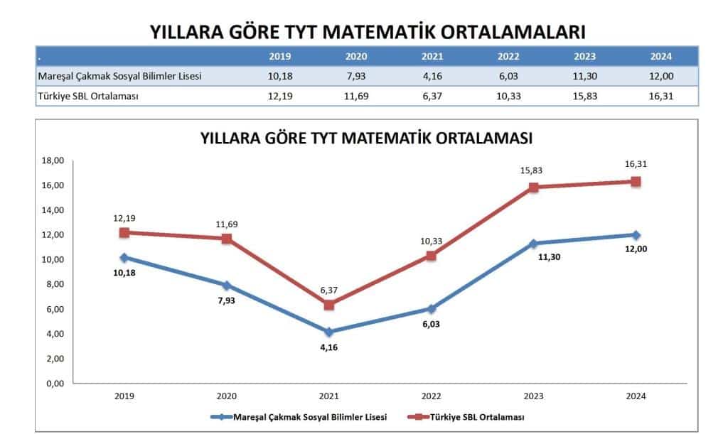 Mareşal Çakmak Sosyal Bilimler Lisesi'nin Temel Matematik ortalaması, 2019-2024 dönemi boyunca Türkiye SBL Ortalaması'nın sürekli olarak altında kalmıştır.