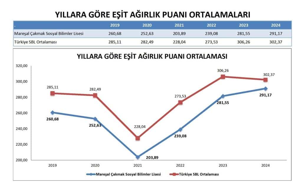 TYT trendine benzer şekilde, Mareşal Çakmak Sosyal Bilimler Lisesi'nin Eşit Ağırlık puanları 2019'dan 2022'ye kadar ulusal SBL ortalamasının altında kalmıştır.